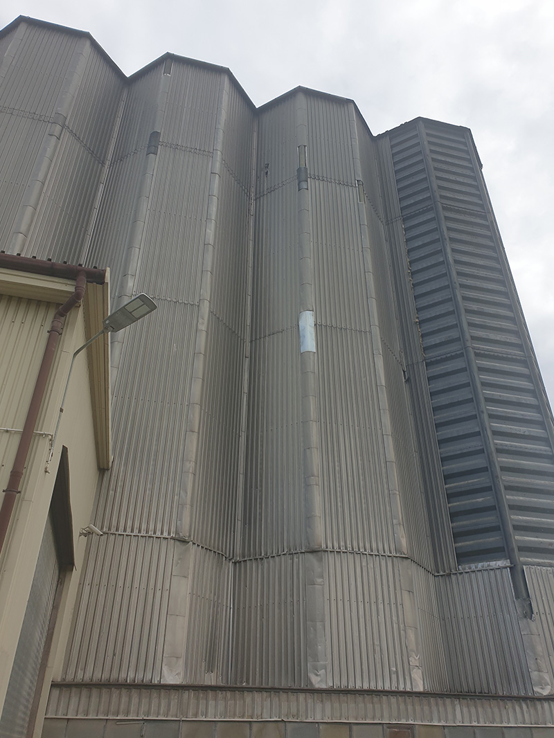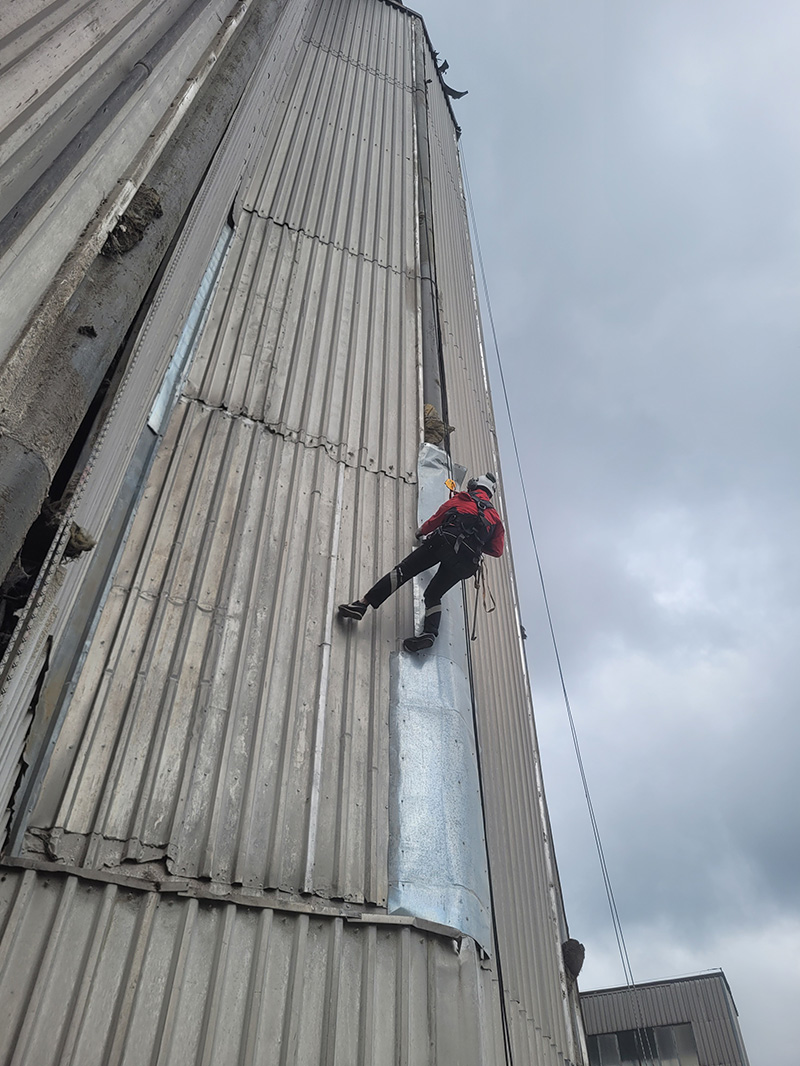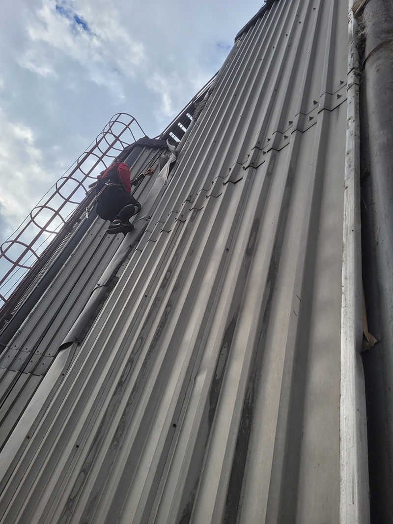 Demontaż starych blach elewacyjnych na silosach o łącznej powierzchni 3500m².