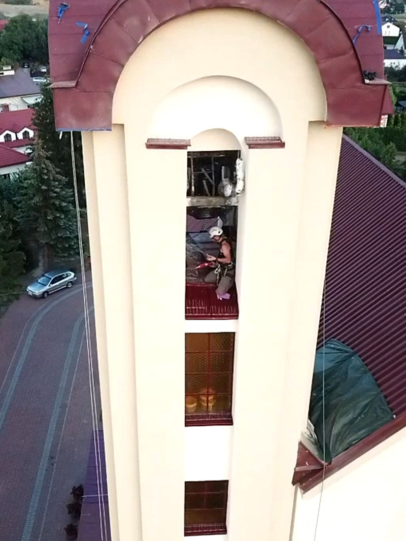 Zakres prac obejmujący malowanie elewacji wiezy kościoła w Latoszynie przez pracowników ALPINVAR został udokumentowany w fotorelacji poniżej: