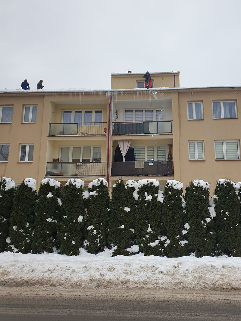 Fotorelacja z wykonanych prac na wysokości obejmujących odśnieżanie dachu oraz zbijanie sopli, likwidowanie nawisów śnieżnych w Przemyślu została udokumentowana na zdjęciach poniżej:
